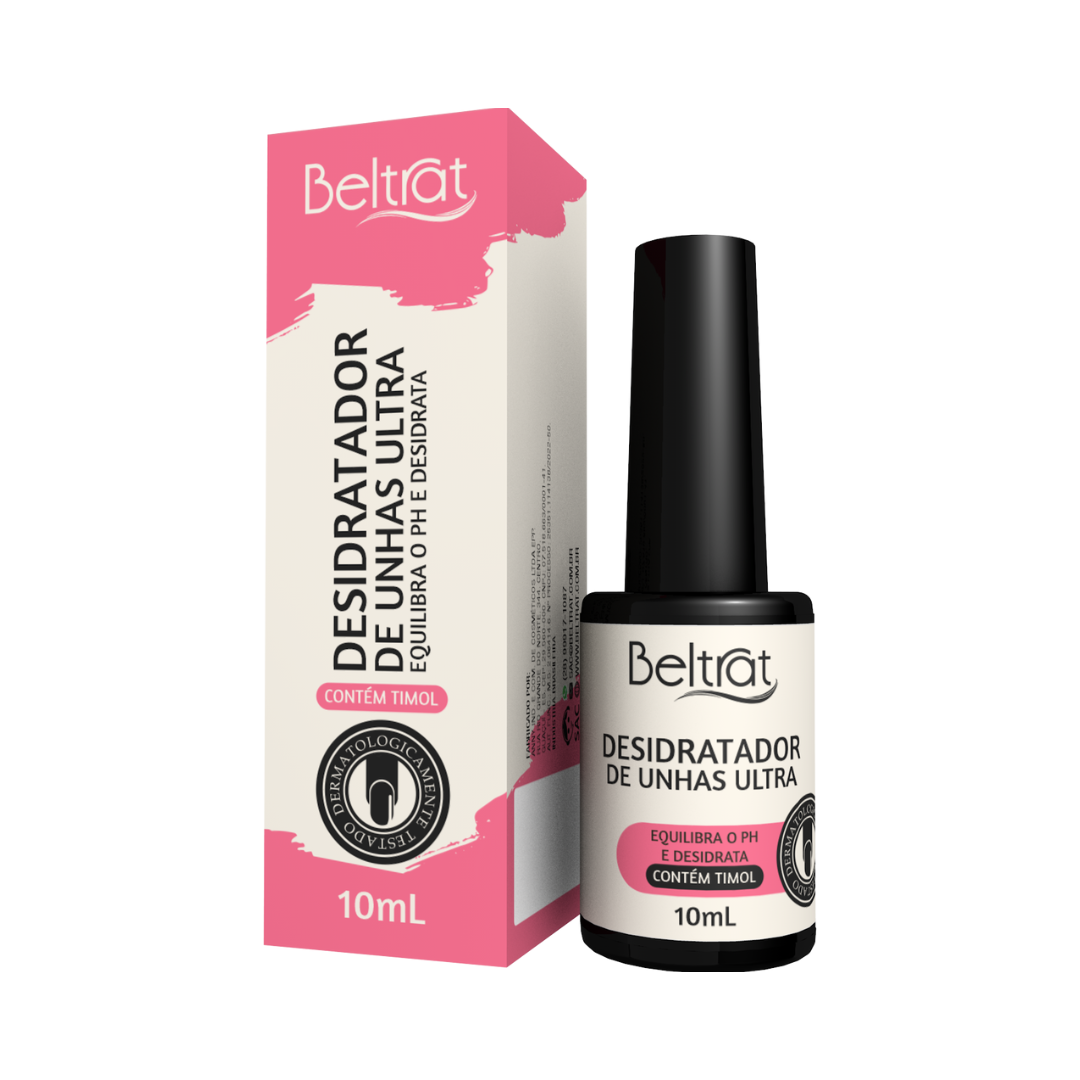 O Desidrat Ultra Beltrat, o único desidratador com Timol, um antifúngico eficaz para eliminar parasitas. Este produto exclusivo tem a função de regular o pH das unhas, removendo a umidade e oleosidade, além de tratar possíveis fungos, preparando-as adequadamente para receber os produtos de alongamento.